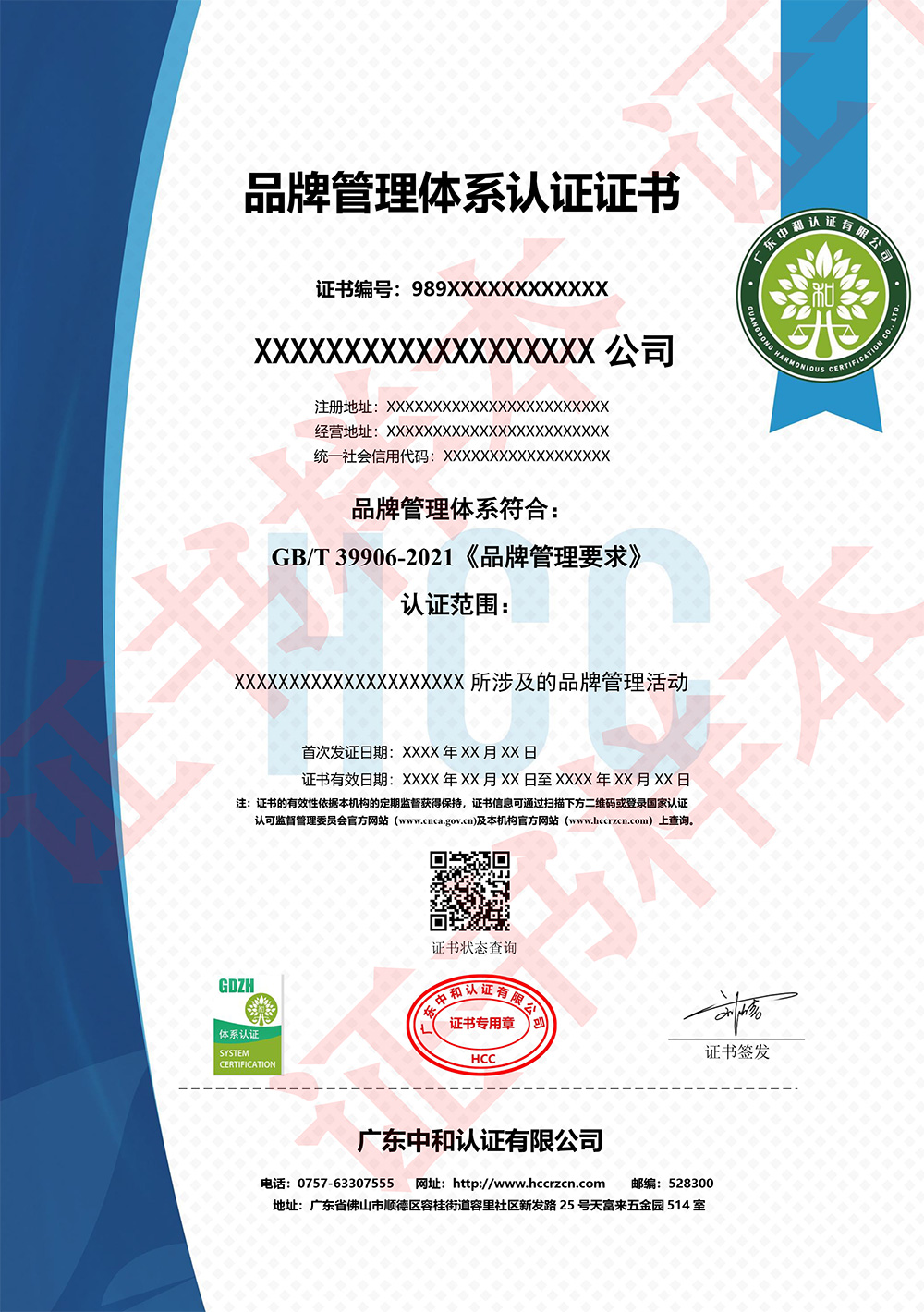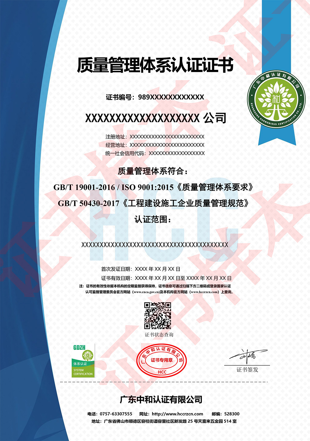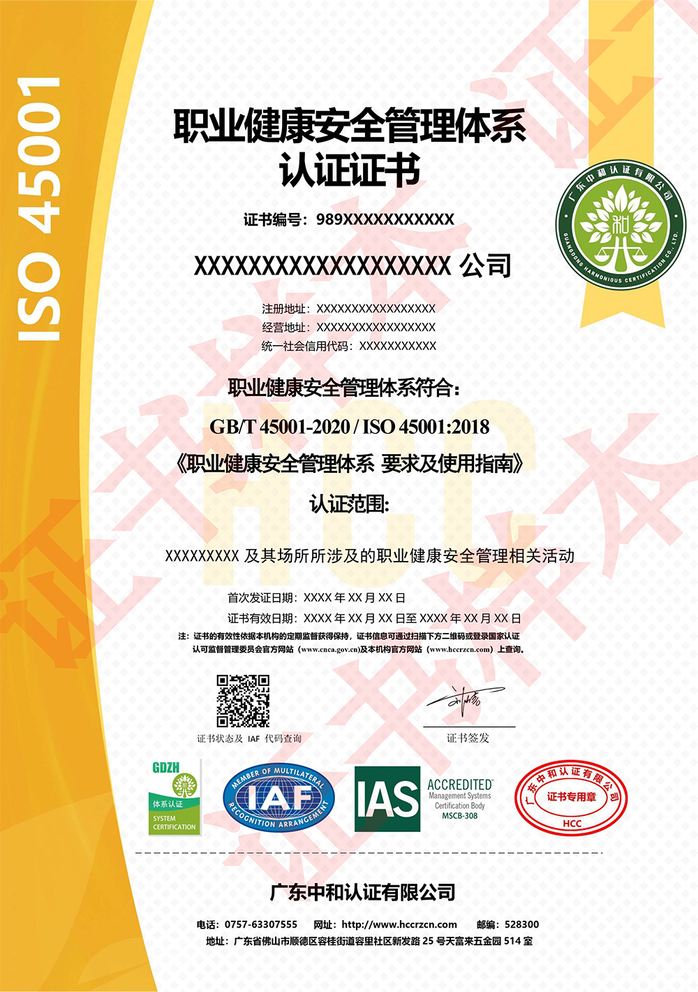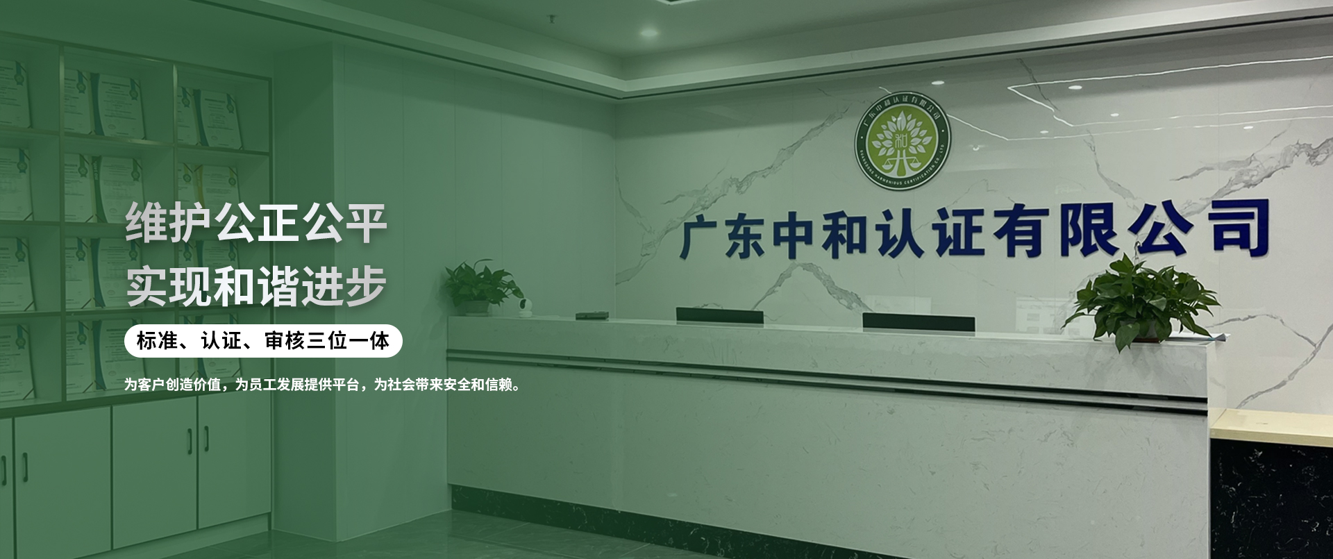 廣東中和認證有限公司(簡稱中和認證,英文縮寫HCC),是經中國國家認證監督管理委員會批準(批準號:CNCA-R-2022-989)的第三方認證機構,主要從事質量管理體系(ISO9001)、環境管理體系(ISO14001)、職業健康安全體系(ISO45001)等認證。通過打造標準、認證、審核三位一體的發展理念,為客戶創造價值,為員工發展提供平臺,為社會帶來安全和信賴。