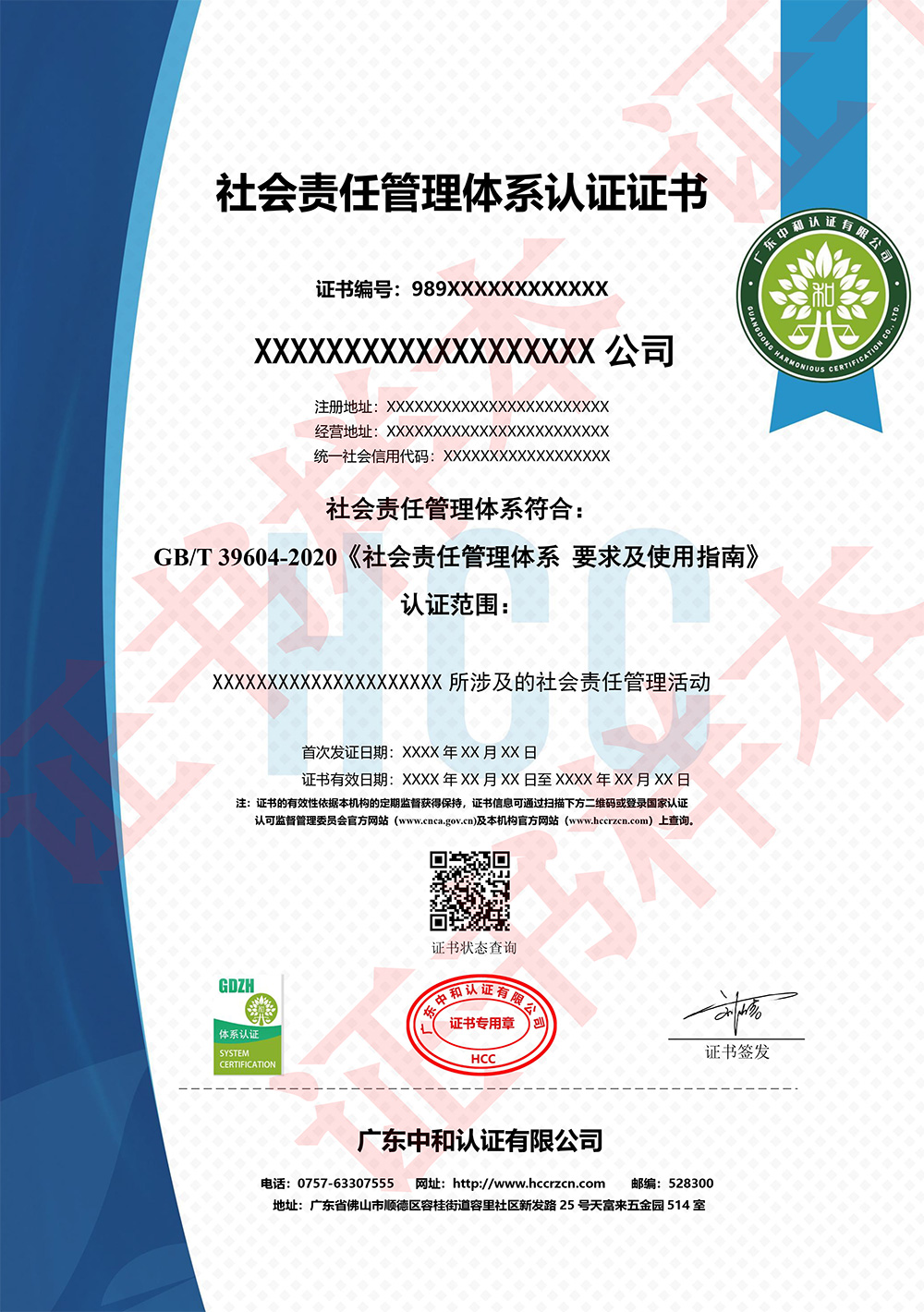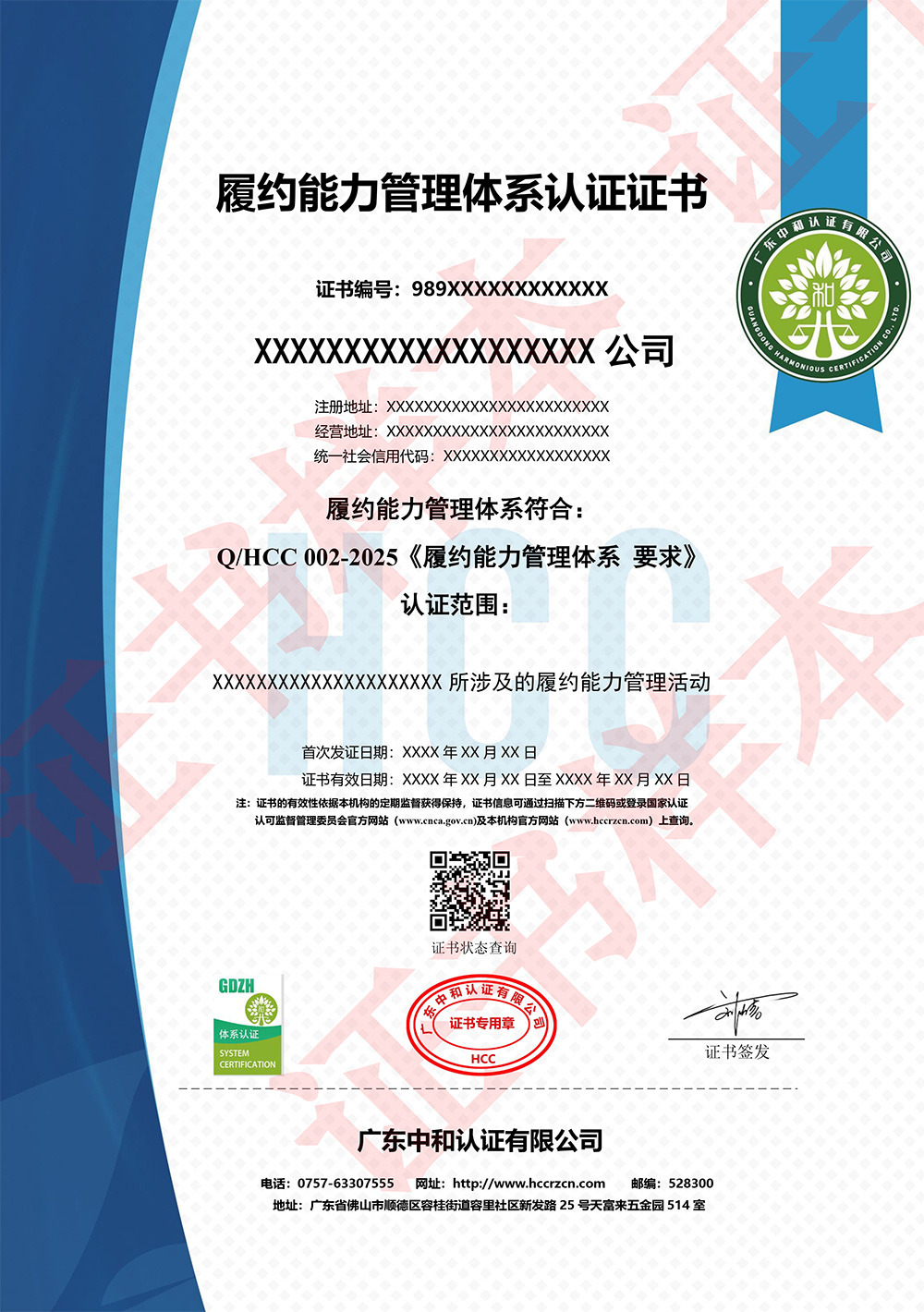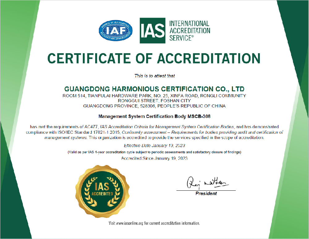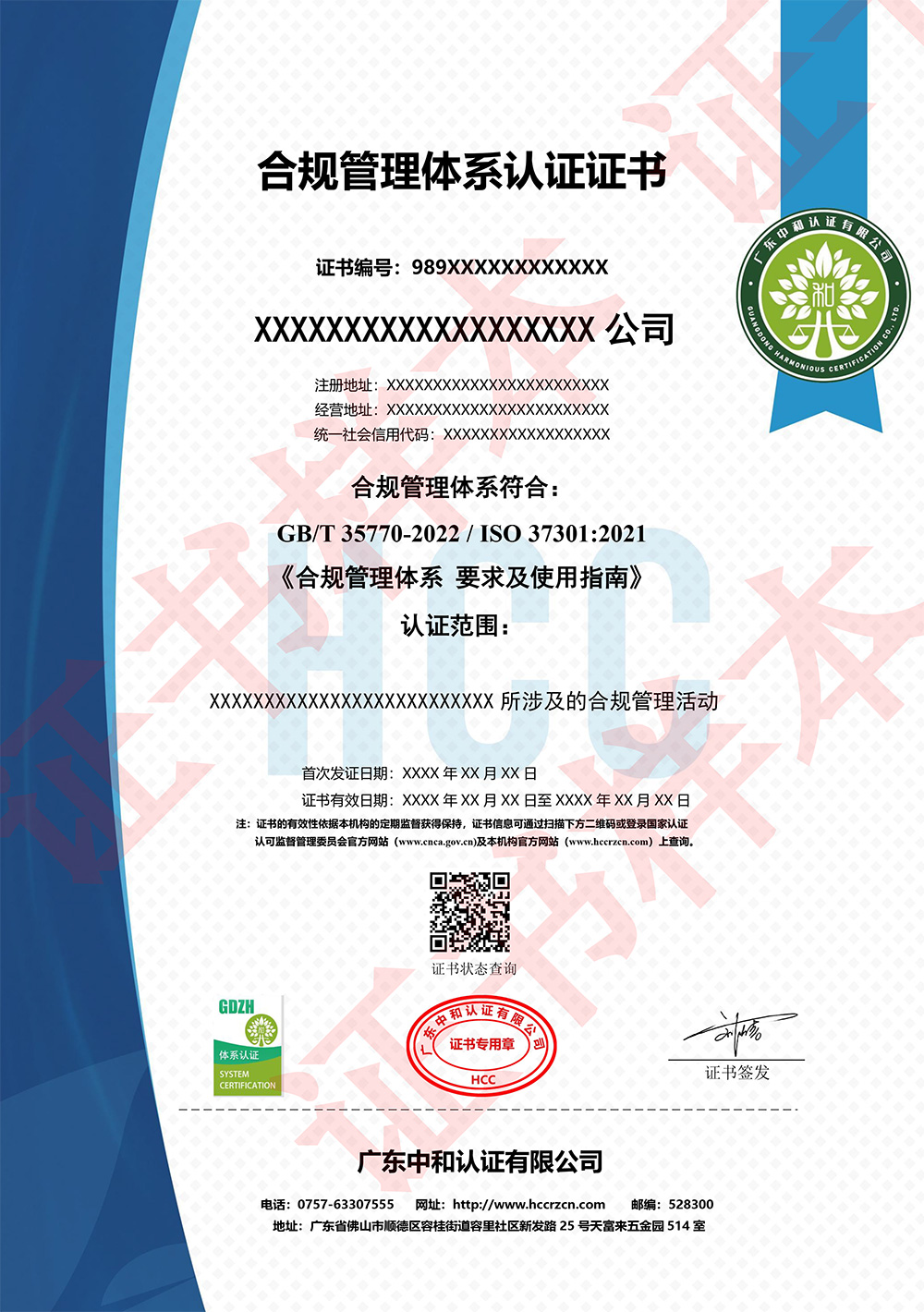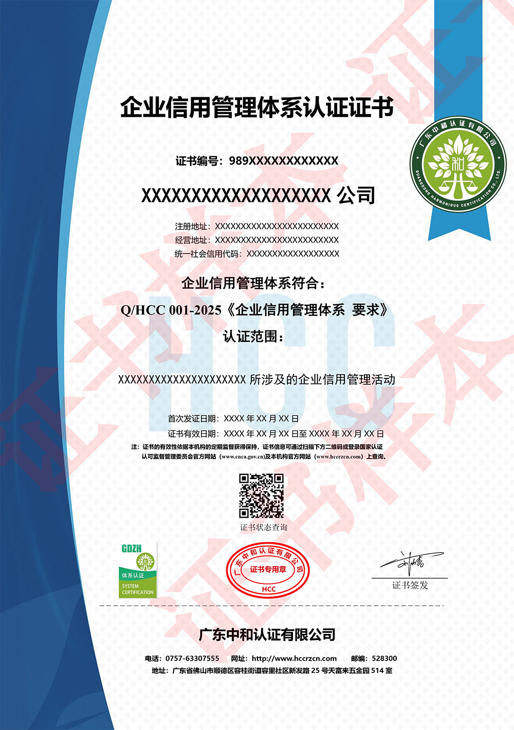 廣東中和認證有限公司(簡稱中和認證,英文縮寫HCC),是經中國國家認證監督管理委員會批準(批準號:CNCA-R-2022-989)的第三方認證機構,主要從事質量管理體系(ISO9001)、環境管理體系(ISO14001)、職業健康安全體系(ISO45001)等認證。通過打造標準、認證、審核三位一體的發展理念,為客戶創造價值,為員工發展提供平臺,為社會帶來安全和信賴。