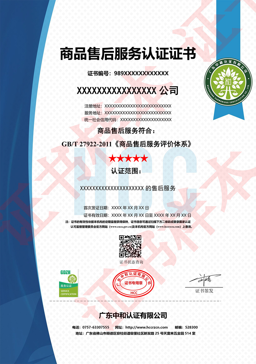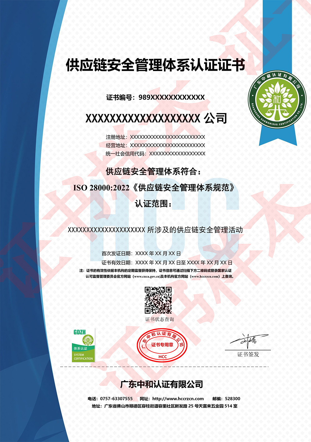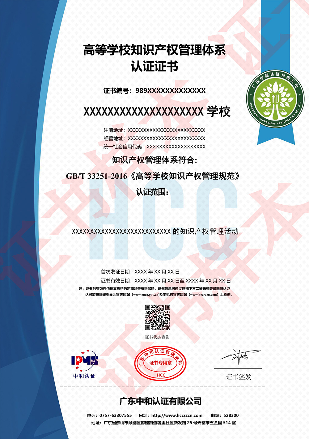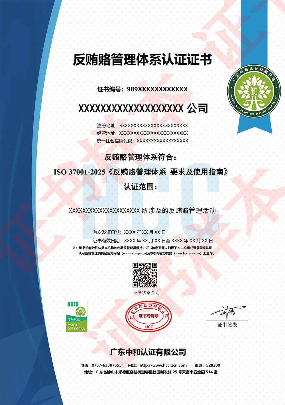 廣東中和認證有限公司(簡稱中和認證,英文縮寫HCC),是經中國國家認證監督管理委員會批準(批準號:CNCA-R-2022-989)的第三方認證機構,主要從事質量管理體系(ISO9001)、環境管理體系(ISO14001)、職業健康安全體系(ISO45001)等認證。通過打造標準、認證、審核三位一體的發展理念,為客戶創造價值,為員工發展提供平臺,為社會帶來安全和信賴。